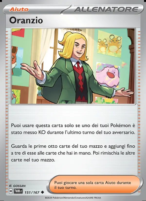 Puoi usare questa carta solo se uno dei tuoi Pokémon è stato messo KO durante l'ultimo turno del tuo avversario. Guarda le prime otto carte del tuo mazzo e aggiungi fino a tre di esse alle carte che hai in mano. Poi rimischia le altre carte nel tuo mazzo.