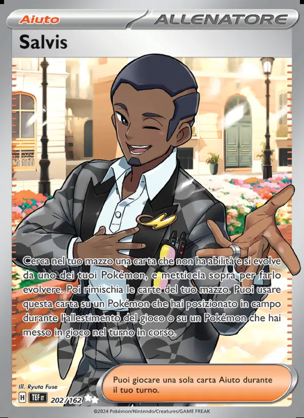 Cerca nel tuo mazzo una carta che non ha abilità e si evolve da uno dei tuoi Pokémon, e metticela sopra per farlo evolvere. Poi rimischia le carte del tuo mazzo. Puoi usare questa carta su un Pokémon che hai posizionato in campo durante l'allestimento del gioco o su un Pokémon che hai messo in gioco nel turno in corso.