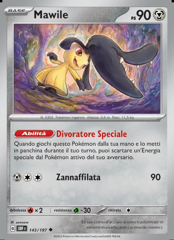 Ability: Quando giochi questo Pokémon dalla tua mano e lo metti in panchina durante il tuo turno, puoi scartare un'Energia speciale dal Pokémon attivo del tuo avversario.
