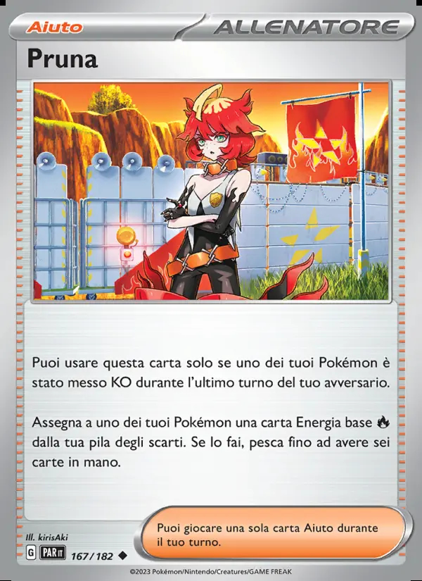 Puoi usare questa carta solo se uno dei tuoi Pokémon è stato messo KO durante l'ultimo turno del tuo avversario. Assegna a uno dei tuoi Pokémon una carta Energia base {R} dalla tua pila degli scarti. Se lo fai, pesca fino ad avere sei carte in mano.