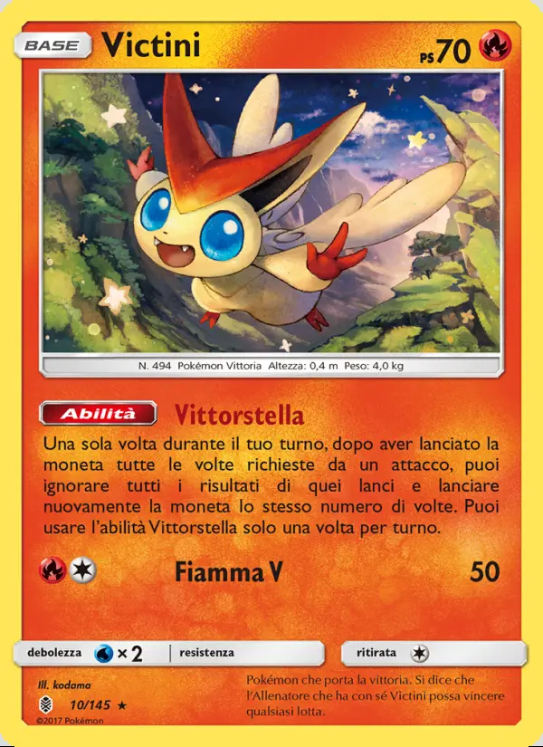 Ability: Una sola volta durante il tuo turno, dopo aver lanciato la moneta tutte le volte richieste da un attacco, puoi ignorare tutti gli effetti di quei lanci e lanciare nuovamente la moneta. Puoi usare l’abilità Vittorstella solo una volta per turno.
