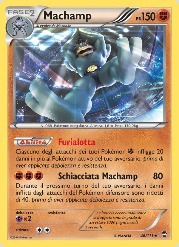 Ability: Ciascuno degli attacchi dei tuoi Pokémon Fighting infligge 20 danni in più al Pokémon attivo del tuo avversario, prima di aver applicato debolezza e resistenza.